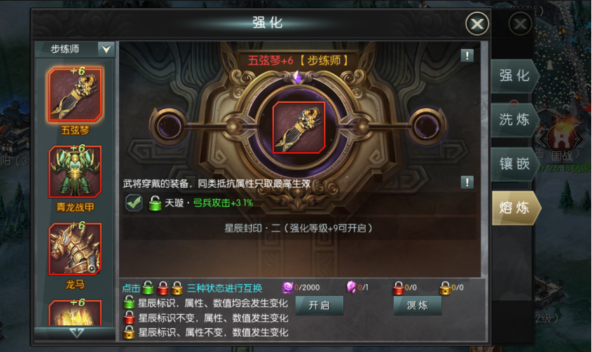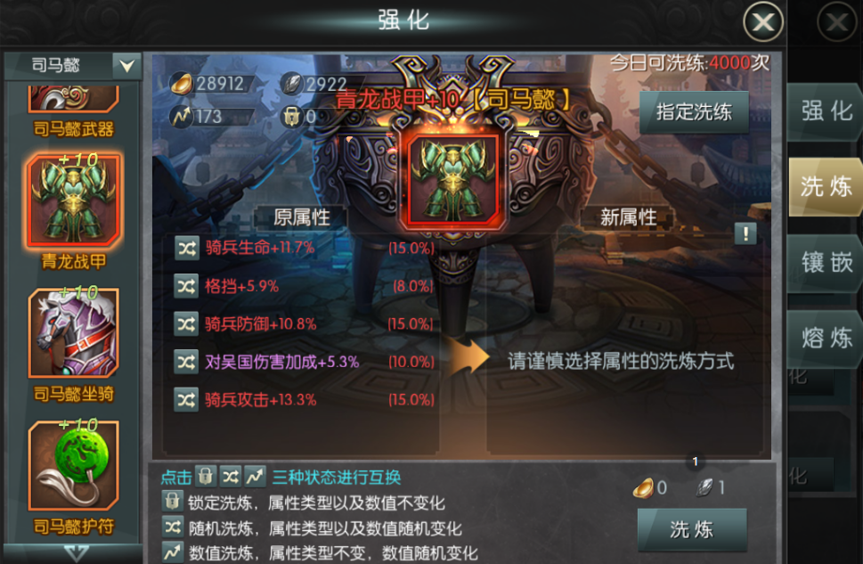 2.?洗練屬性中有三個(gè)屬性必須為兵種的加成,這三個(gè)就是對應(yīng)你的武將所帶的兵種,分別有(騎兵,弓兵,步兵)一定要洗練到你相對應(yīng)的兵種,若你的武將帶的是騎兵,就一定要把4件裝備洗練到騎兵的加成,給武將最大值的(生命,防御,攻擊加成)。