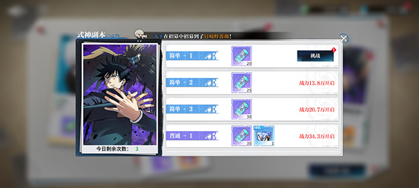 3、隨著你的戰(zhàn)力不斷提升,在式神副本中挑戰(zhàn)更高級的難度副本,可以獲得更高品質(zhì)的式神碎片,每天挑戰(zhàn)的次數(shù)記得一定要完成,產(chǎn)出的材料性價比很高,就算花費鉆石完成也是必須的。