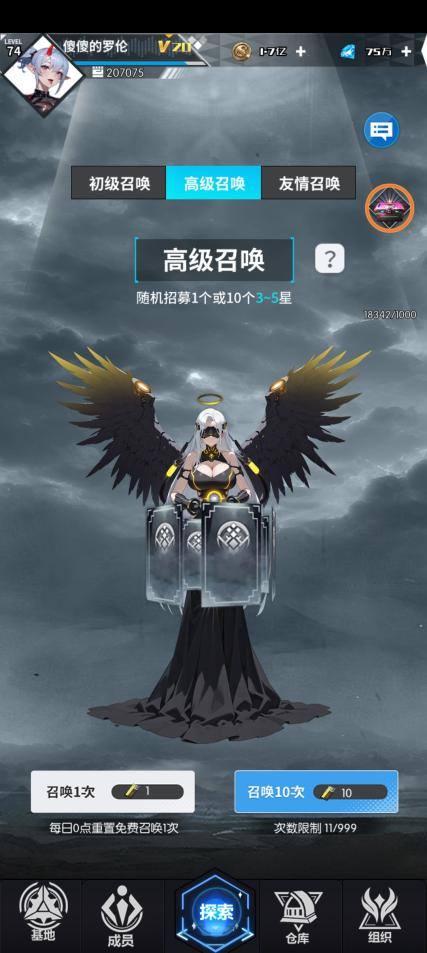 角色招募分為初級(jí)召喚、高級(jí)召喚和友情召喚。初級(jí)召喚及友情召喚有較小概率獲取普通三系(天、地、人)和普通神魔五星英雄,高級(jí)召喚有較高概率獲取普通三系(天、地、人)和普通神魔五星英雄,友情召喚需要冒險(xiǎn)家添加好友并相互增送友情點(diǎn)后方可使用。